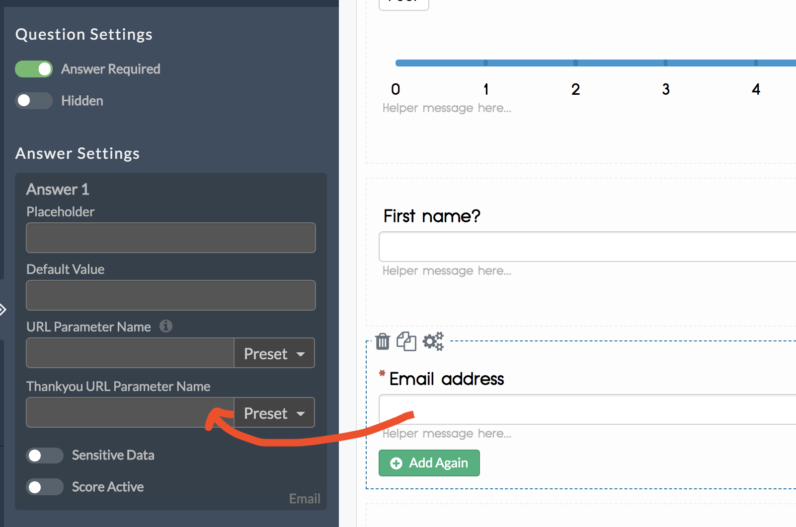 2. Here you will see you can give a field a Thank You URL Parameter Name. Give this a name, such as Name or Email Address.